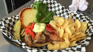 Seasoned 1/2 lb. Burger Topped with Sautéed Roasted Red Peppers and Caramelized Onions. Served on a Kaiser Bun with Pepper Bacon, Lettuce, and our House-Made Cilantro-Lime Aioli