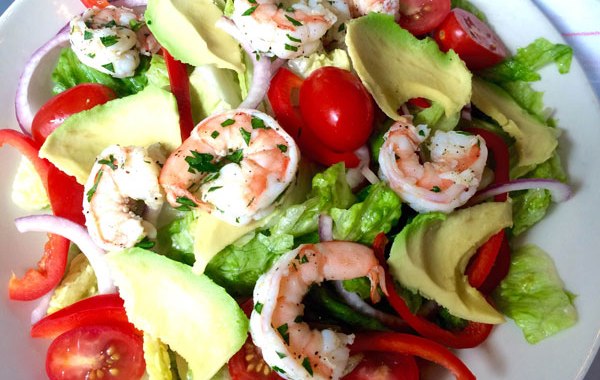 Marinated Shrimp mixed with Red Pepper, Red Onion, Cherry Tomatoes, and Avocados, over a bed of Romaine tossed in a Red Wine Vinaigrette