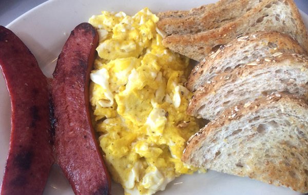 Four Eggs Prepared The Way You Like Them with 3 Pieces of Toasted Bread of Your Choice. Served with Grilled Andouille Sausage