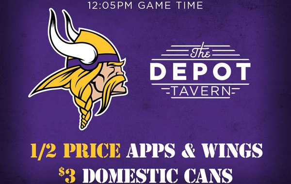 Join us on Sunday, January 10, 2016 to watch the Vikings take on the Seattle Seahawks in the first round of the NFL playoffs. We’ll have the NBC game broadcast on every TV in The Depot! Kickoff is scheduled for 12:05pm at TCF Stadium.